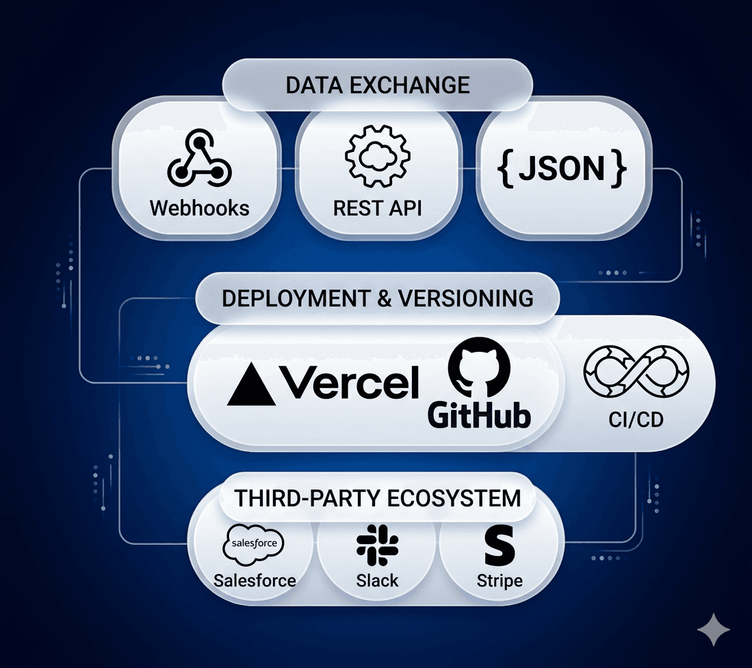 Connect APIs, webhooks, and databases with monitoring and fail-safe logic.
