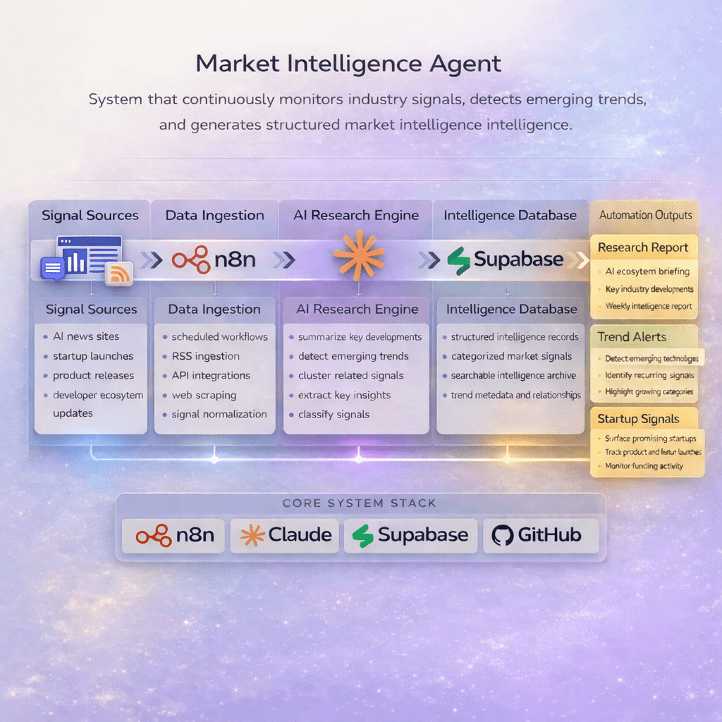 Earlier in my career working in strategy and competitive intelligence, I spent hours scanning news feeds, product launches, and industry updates just to stay on top of what was happening in the market. I built this system to automate that process continuously collecting signals across the AI ecosystem and turning them into structured research insights.