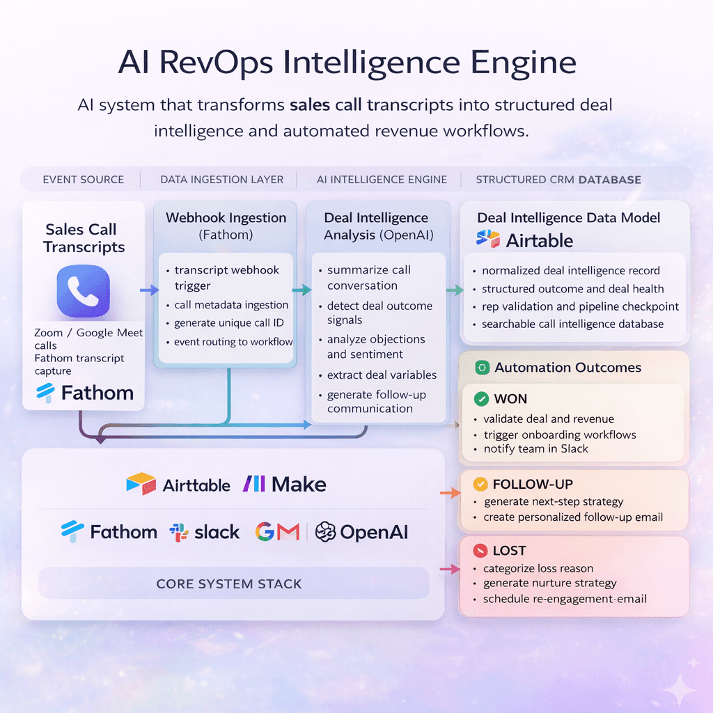 Sales calls contain a lot of deal insight, but most of it never makes it into the CRM. I built this system to turn call transcripts into structured deal data and trigger the right follow-up workflows automatically.